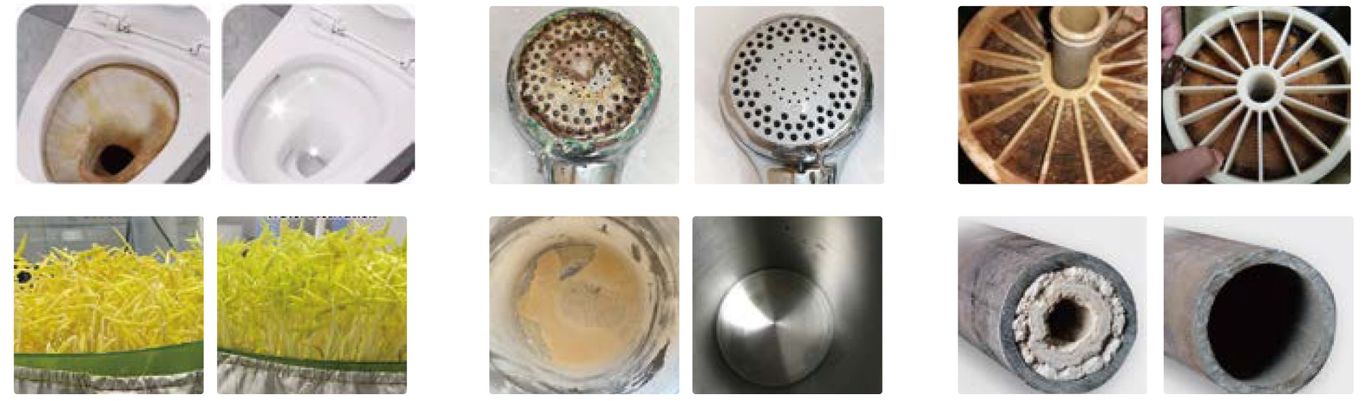 Avantages : améliore l’efficacité de la conduction thermique du chauffe-eau, prolonge la durée de vie de tous les appareils électroménagers utilisant de l'eau, assure un écoulement d’eau fluide pour éviter les bouchages, augmente l’efficacité du nettoyage et réduire l’utilisation de détergent dans les machines à laver, améliore la saveur du café et maintient l’efficacité du brassage de votre machine à café, facilite le nettoyage des sanitaires, disparition du dépôt blanc dans le lavabo, sur les vitres de la douche et sur la robinetterie.