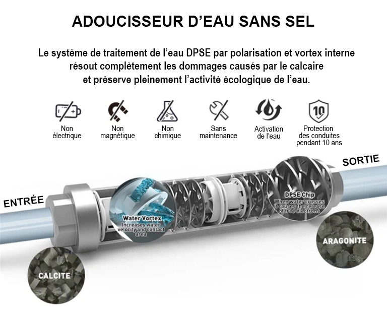 L'adoucisseur d'eau sans sel est composé d’une coque et de plusieurs hélices anticalcaires en acier inoxydable type 304.