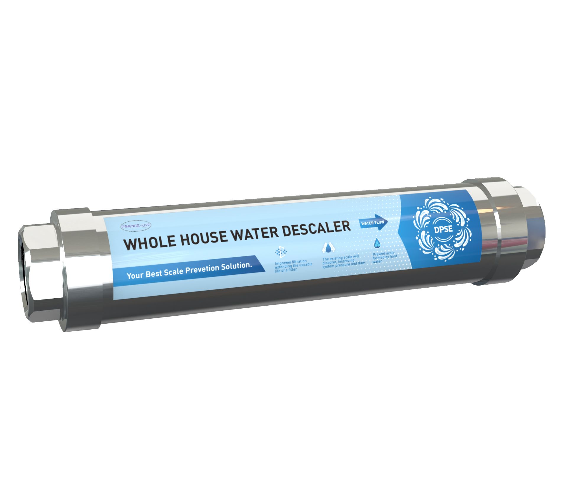 L'adoucisseur d’eau DPSE est fabriqué à partir d’un alliage de neuf métaux, dont du cuivre et du zinc. Lorsque l’eau s’écoule à travers l'adoucisseur, elle libère un grand nombre d’électrons libres, induisant les molécules d’eau à se polariser. Cette transformation désagrège la structure moléculaire du tartre, qui passe de l'état calcite dure à celle d'aragonite molle, provoquant ainsi le détachement du calcaire. Les molécules d’eau polarisées inhibent la liaison de Ca2+, Mg2+, CO 2- et OH-, assurant ainsi la prévention du tartre dans les canalisations. C'est également efficace contre la rouille et prévient la corrosion.