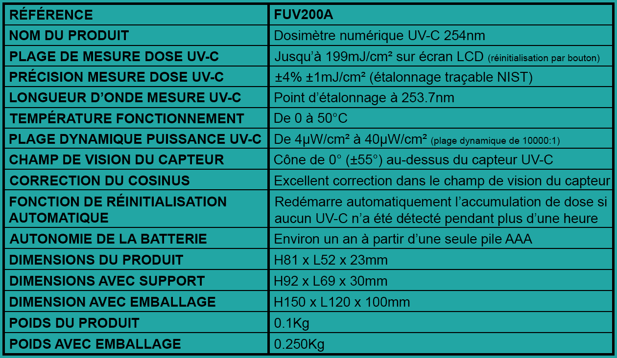 Le dosimètre FUV200A permet une mesure pratique et précise de la dose de lumière ultraviolette UV-C. La précision est assurée par un étalonnage en usine à 253,7nm à l'aide d'un wattmètre de référence certifié NIST.