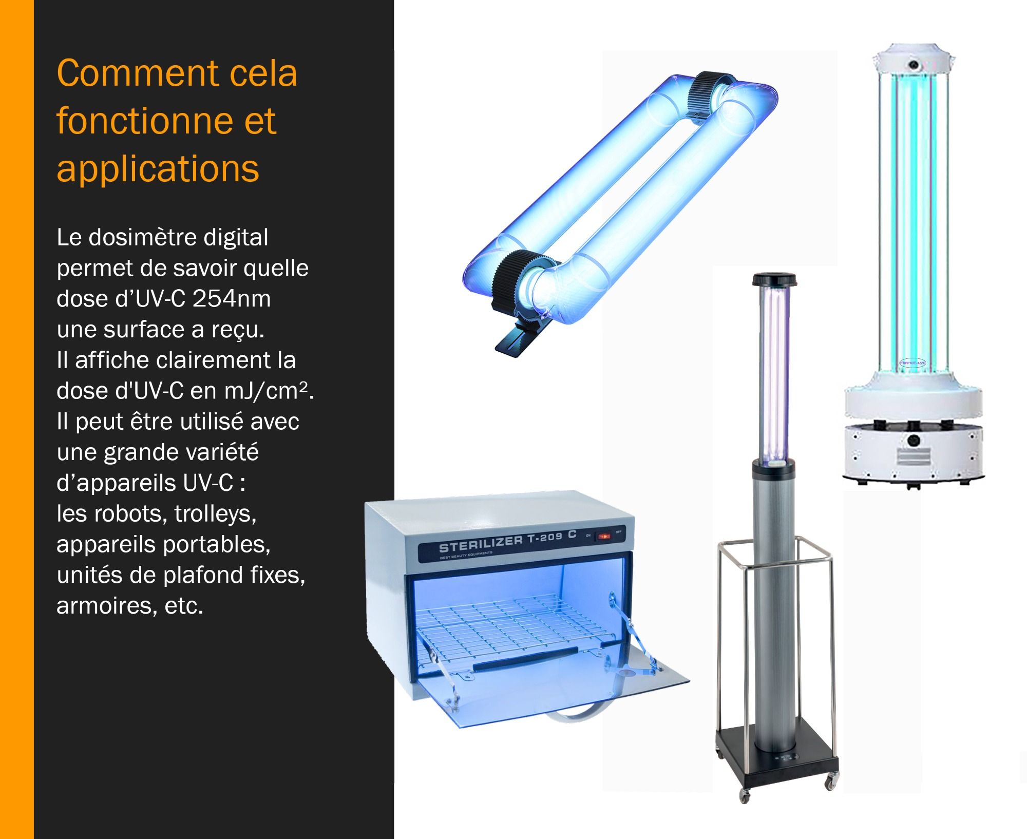 Il convient pour mesurer l'irradiation d'une grande variété d'appareils UV-C comme les robots autonomes, tours mobiles, trolleys, plafonniers fixes, unités portatives, armoires, etc.