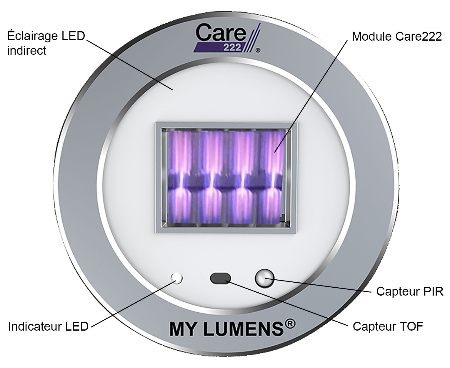 Son module de désinfection Care222® est équipé d'un capteur de présence PIR, d'un capteur de distance TOF pour un fonctionnement en toute sécurité et d'un indicateur Led.