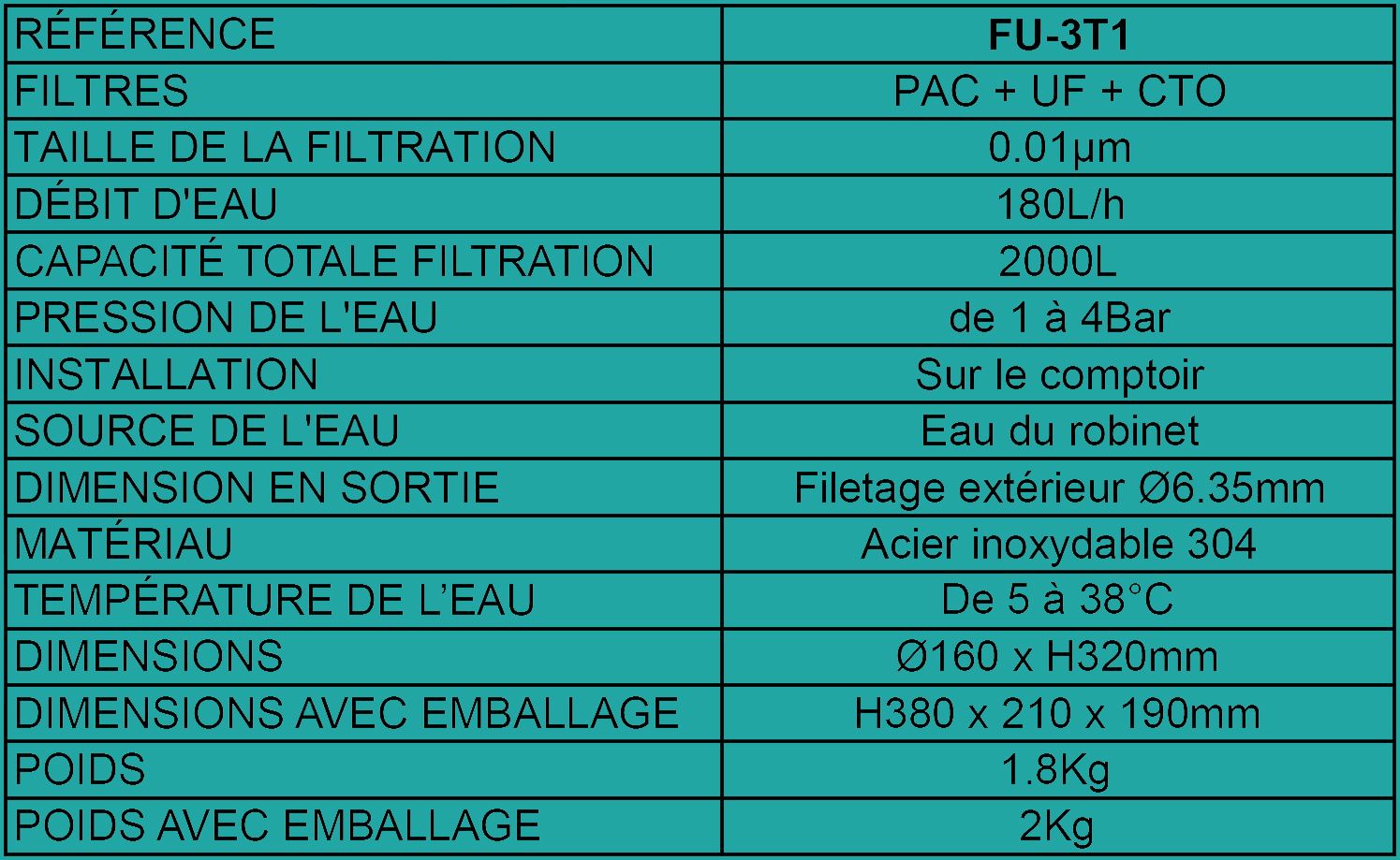 Grâce à sa filtration à 0.01 micron, le modèle FU-3T1 purifie l'eau de votre robinet avec une grande efficacité. Cette filtration rend l'eau plus saine et prête à boire, tout en conservant les minéraux essentiels.
