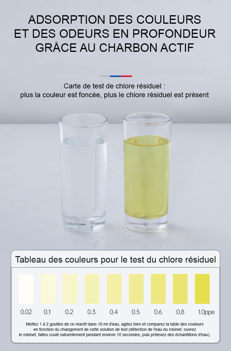 - Un filtre charbon actif CTO qui adsorbe le chlore résiduel, les odeurs, la coloration et élimine le mauvais goût de l'eau.