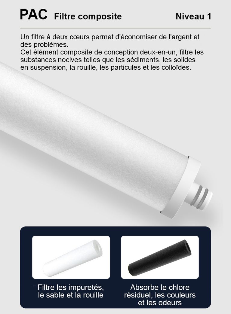 - Un filtre composite PAC qui retient les impuretés, le sable, la rouille, les sédiments, les solides en suspension, les colloïdes.