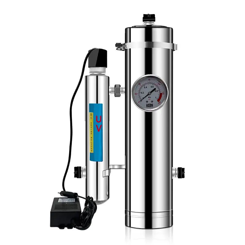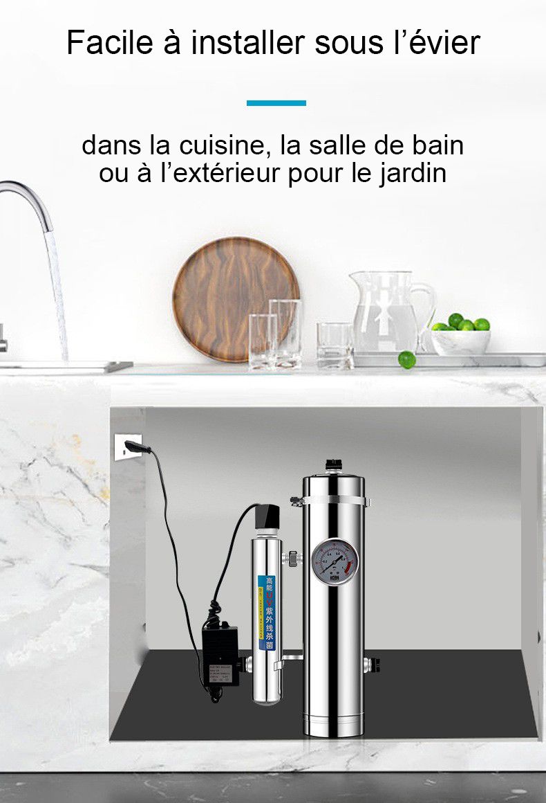 Le système de filtration FU-WHPVDF-UV a été conçu pour purifier l'eau du robinet au domicile, dans une chambre d'hôtel, un bar/café, avec un débit de 1000L/h, à une pression de 1 à 4 Bar, visible grâce à un manomètre.