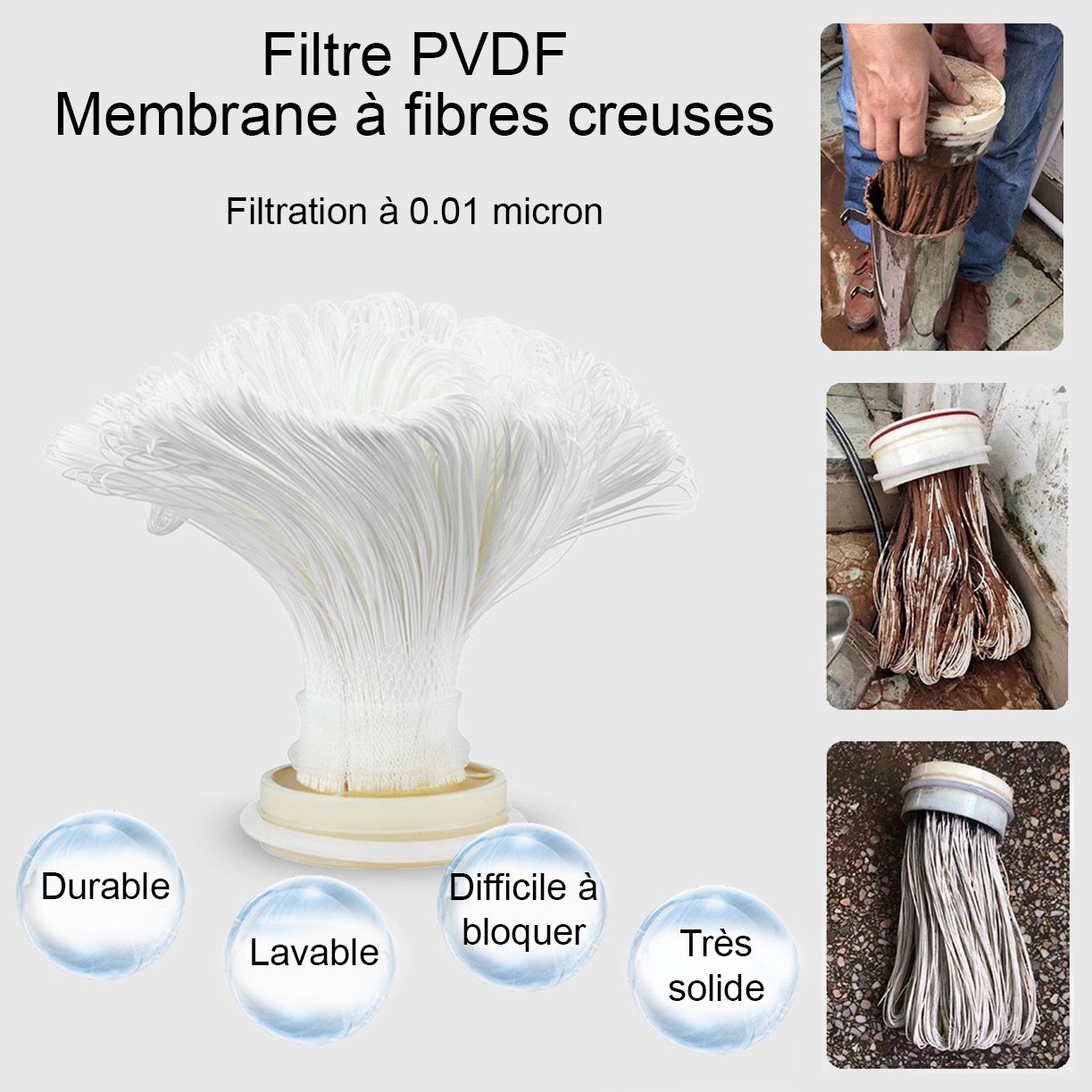 À l'intérieur, son filtre PVDF qui est une membrane à fibres creuses fabriquée avec un polymère de polyfluorure de vinylidène, permet une filtration de l'eau à 0.01 micron, avec une efficacité de 99%. Cette membrane est d'une grande efficacité pour retenir les sédiments, la rouille, le limon, les algues, mais aussi à une échelle plus petite les germes, les bactéries et les virus, sans risque d'obturation et sans éliminer les minéraux essentiels présents dans l'eau.