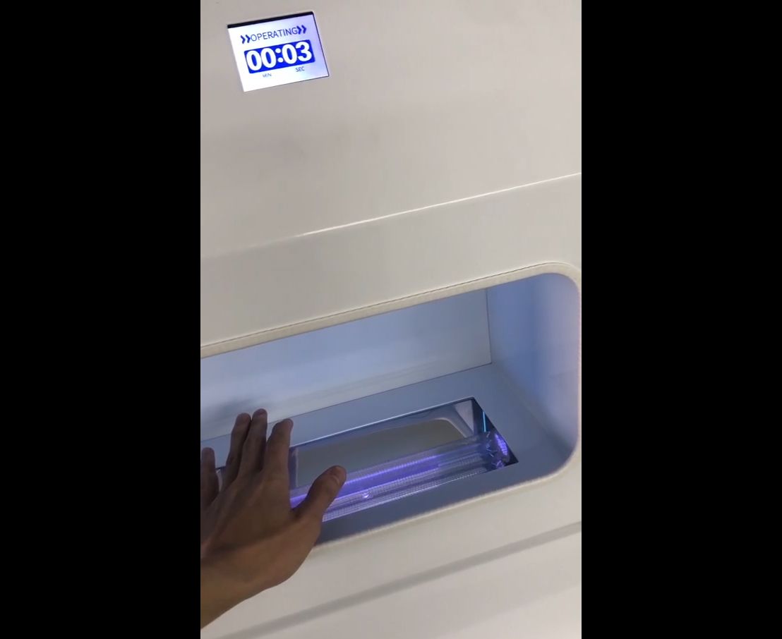 Cette borne de désinfection des mains possède sur le devant, un écran LCD avec minuterie et un détecteur de mouvement à infrarouge, qui allume automatiquement les lampes lorsque l'on place nos mains au-dessus. La minuterie peut être contrôlée grâce à une télécommande. La borne se branche sur une prise 110-240V avec un adaptateur AC/DC 24V.