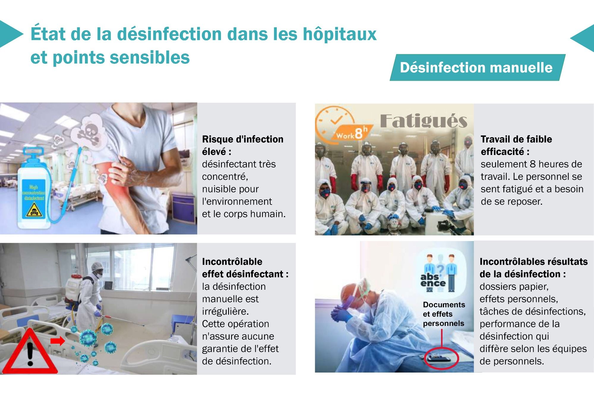 Ils sont tous deux idéals pour désinfecter à 99.9% les grands entrepôts, les immeubles de bureaux, les supermarchés où tout le monde touche tous les produits, les aéroports, mais surtout les lieux sensibles comme les hôpitaux, les cliniques, les urgences, les services des maladies infectieuses, de pneumologie, de stomatologie, d'oto-rhino-laryngologie, de médecine intensive, les salles d'endoscopie, les salles d'opération, les centres d'hémodialyse, les salles d'examen tomodensitométrique, les laboratoires d'analyse des acides nucléiques, les laboratoires P2, P3, P4, les laboratoires PCR et tous les services à hauts risques.