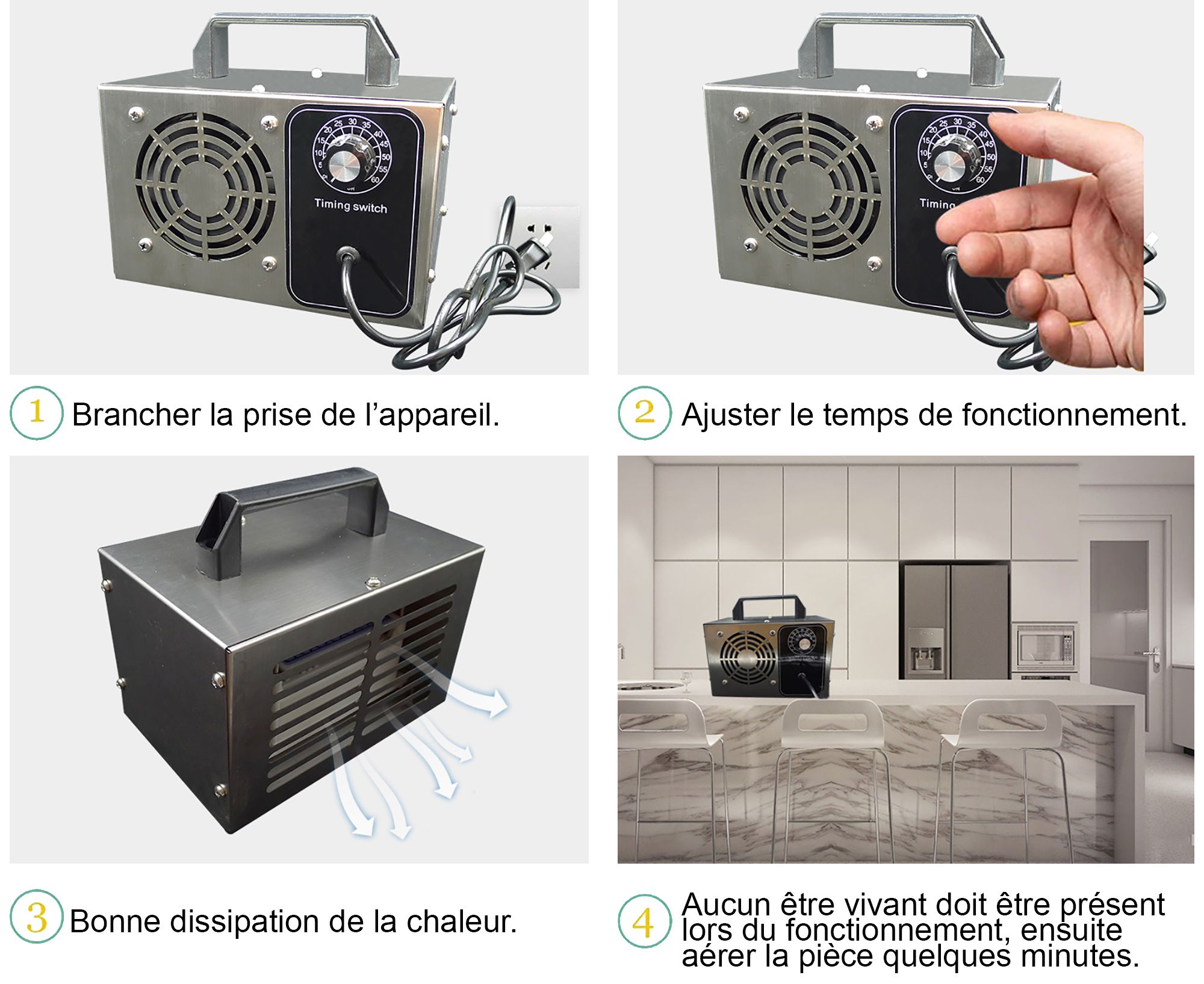 Il suffit de les brancher, de programmer le temps de fonctionnement souhaité. La durée de fonctionnement peut être ajustée grâce à un bouton, en fonction de la superficie à traiter et de l'intensité de l'odeur à éliminer.