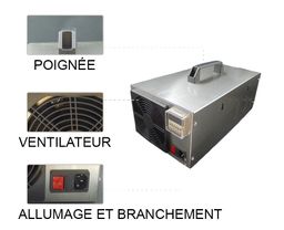 Ce générateur a une production d'ozone de 60g/h. Il est conçu pour désinfecter et désodoriser les grandes superficies de type entrepôts, ateliers de réparation automobile, grands magasins, galeries marchandes, supermarchés, etc.