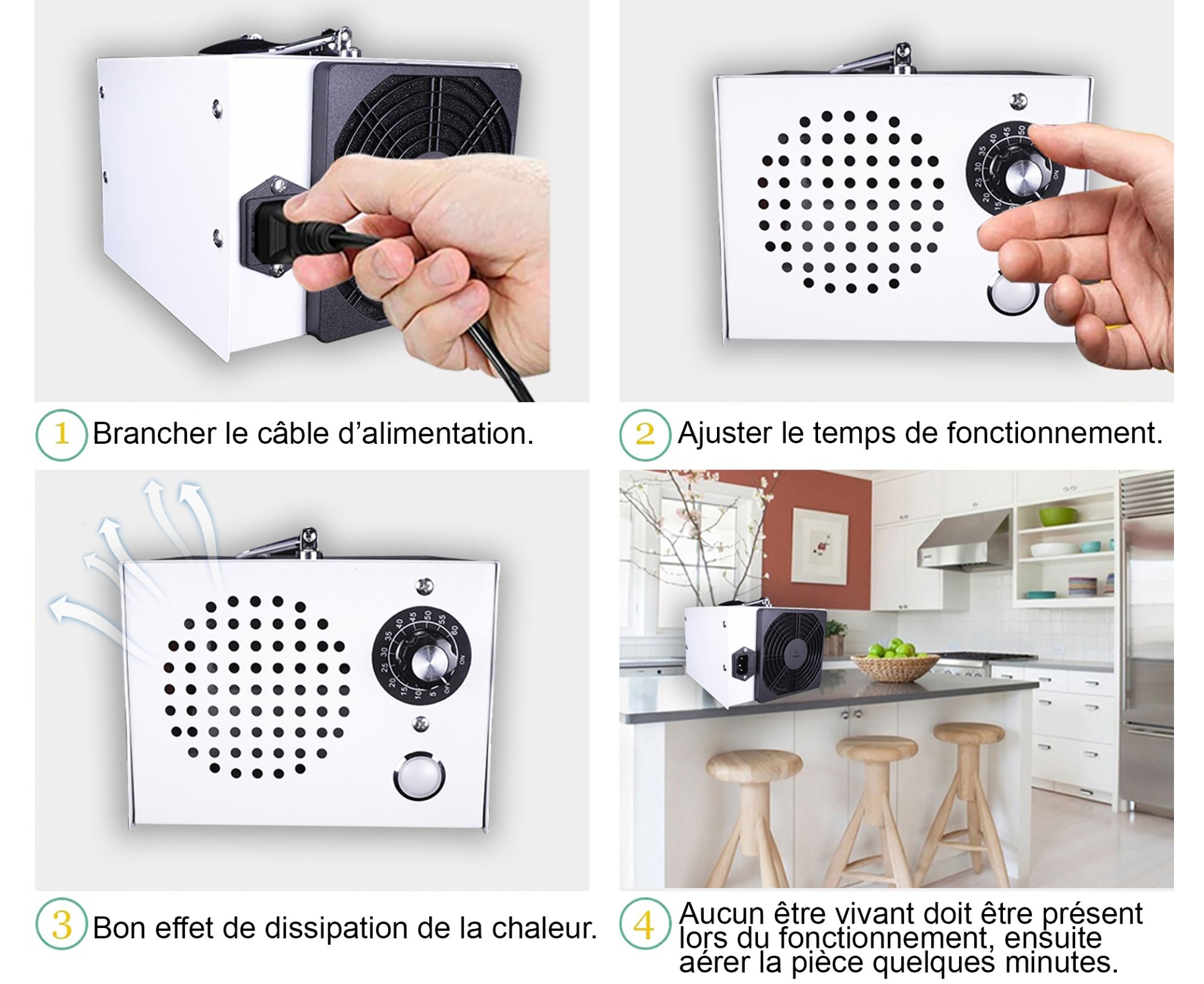 Celui-ci doit impérativement fonctionner en l'absence d'êtres vivants. Il est nécessaire d'aérer les lieux après utilisation, afin que l'ozone redevienne de l'oxygène.