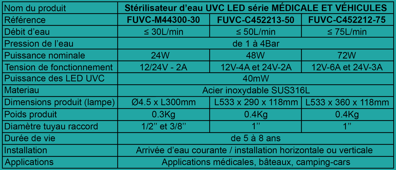 Le stérilisateur d’eau UVC LED de la série médicale et véhicules convient parfaitement aux bateaux, camping-cars, et pour toutes autres applications médicales.